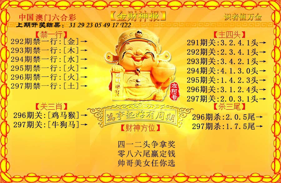 297期: 澳门六合彩彩圖信封【黄财神报】每期自动更新